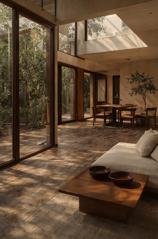 Natural light is allowed to move freely through the space, softening textures and enhancing the warmth of the materials. The layout is intentional yet effortless, designed to feel composed without ever feeling formal.
