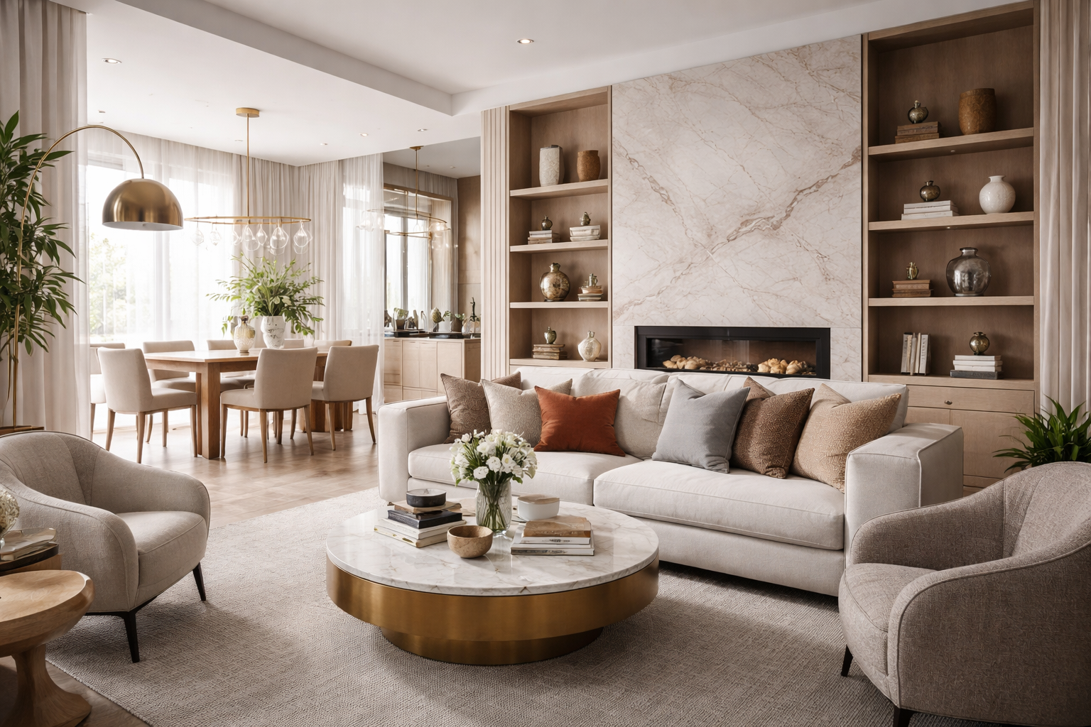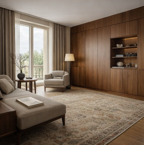This living room is shaped around balance between softness and structure, openness and intimacy. Clean-lined furniture is paired with warm wood detailing to create a space that feels grounded yet inviting.